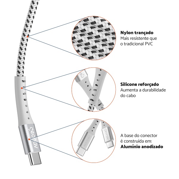 Cabo USB-C para USB-C nylon trançado 1.20MT ESC06WT Branco 1 UN Geonav