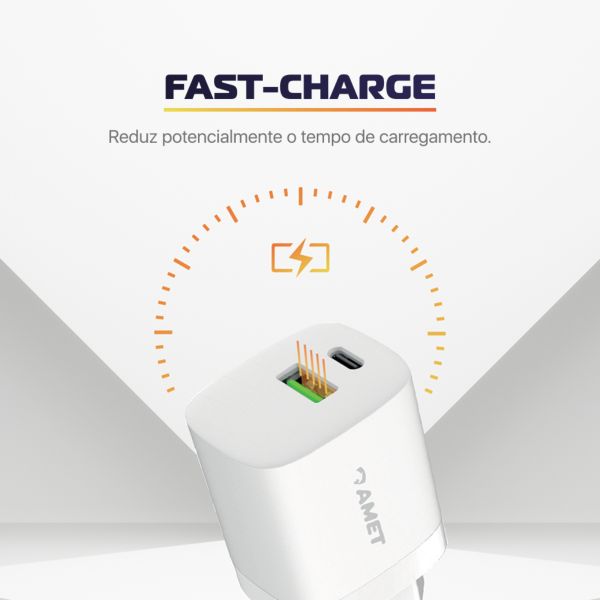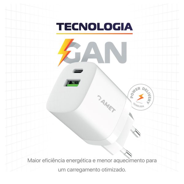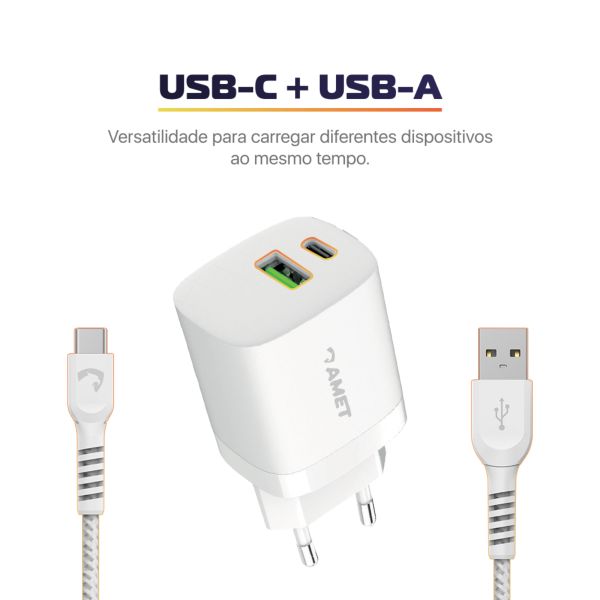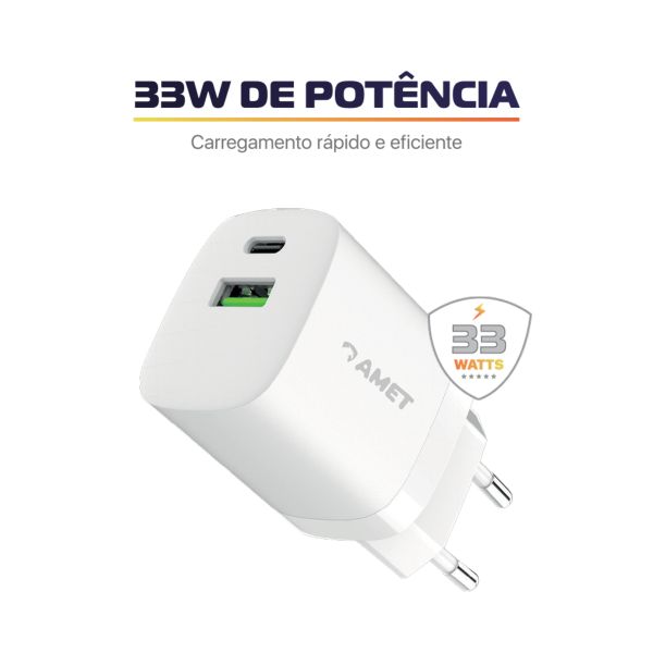 Carregador de Parede AMET GAN 33W, 1 USB-C + 1 USB-A Branco 1 UN