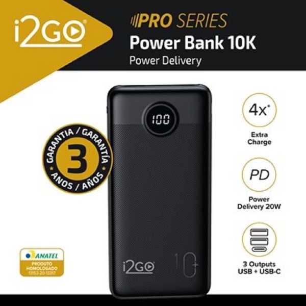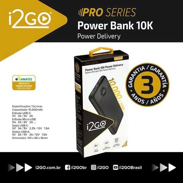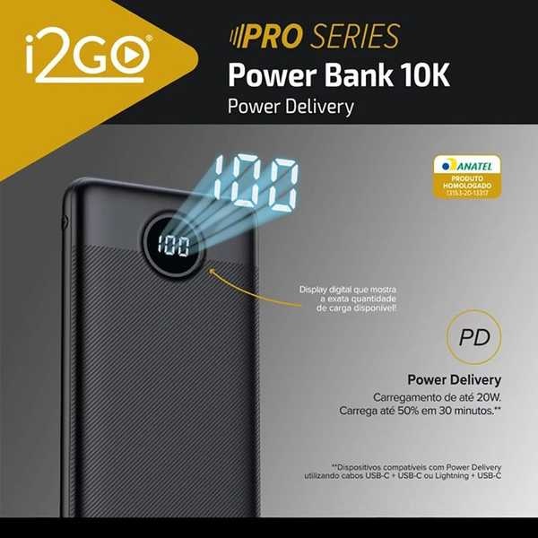 Carregador Portátil Ultra Rápido 10000mAh Power Delivery 20W 2 Saídas USB 1 Saída/Entrada USB-C 1463 Preto 1 UN I2GO PRO