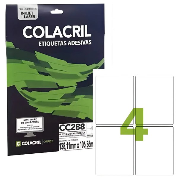 Etiqueta Adesiva Colacril InkJet e Laser Carta 138,11x106,36mm Branco CC288 25 Folhas