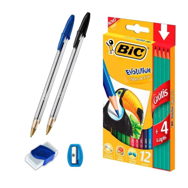 Kit Escolar BIC 12 Lápis de Cor Sextavados 4 Lápis Grafite 2 Canetas Apontador e Borracha CX 1 UN