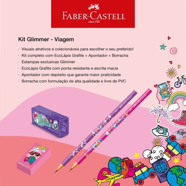 Kit Glimmer Viagem Faber Castell 2 Lápis Preto Redondo + Apontador e Borracha 1 UN