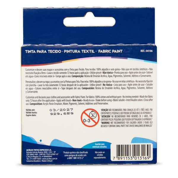 Tinta para Tecido 15ml 6 Cores Acrilex